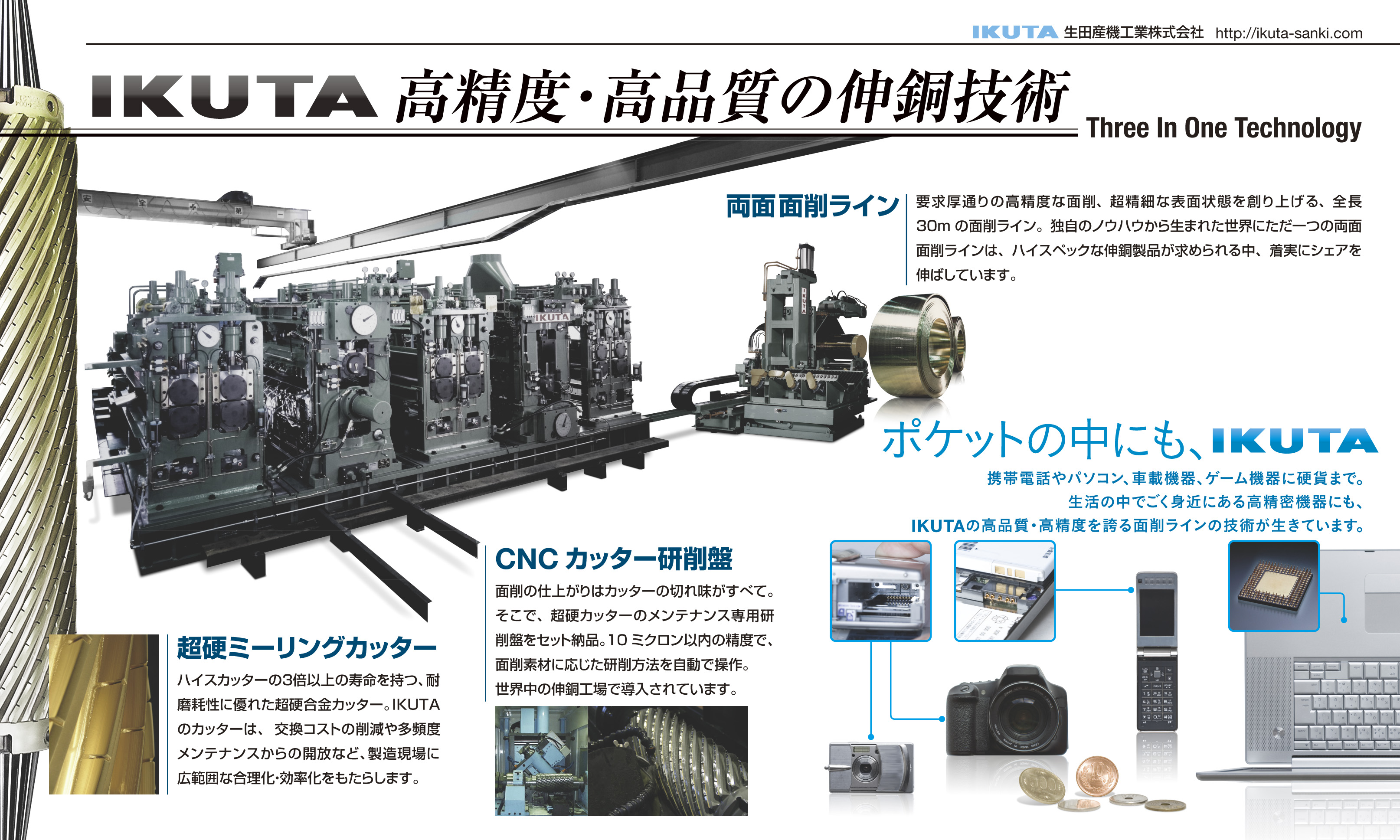 IKUTAは主に「銅と銅合金をはじめとする金属生産設備の設計・製作販売メーカーです。」国内大手複合材メーカーによるヨーロッパ工場への金属樹脂貼合ラインの受注生産や、大学および研究開発機関向けの研究開発用機器、産業用自動化機器の設計製造販売なども行っています。IKUTAは伸銅製品だけにとどまらず、スチールやステンレス、アルミニウムなど様々な分野での高品質な製品開発を進め世界に貢献しています。